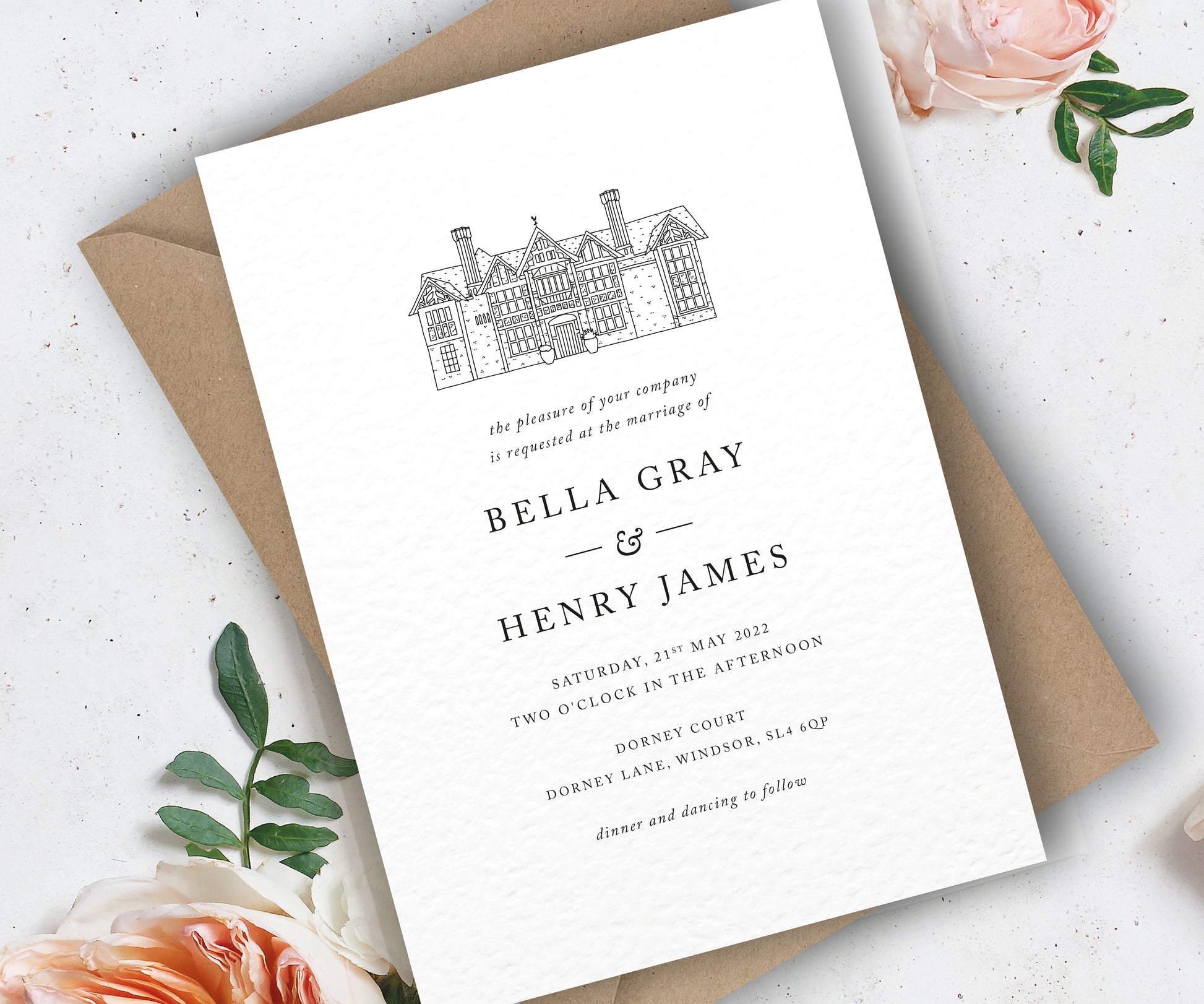 The ‘Bella’ invitation card brings in minimalist design with elegant serif fonts and includes a carefully custom drawn illustration of your venue.